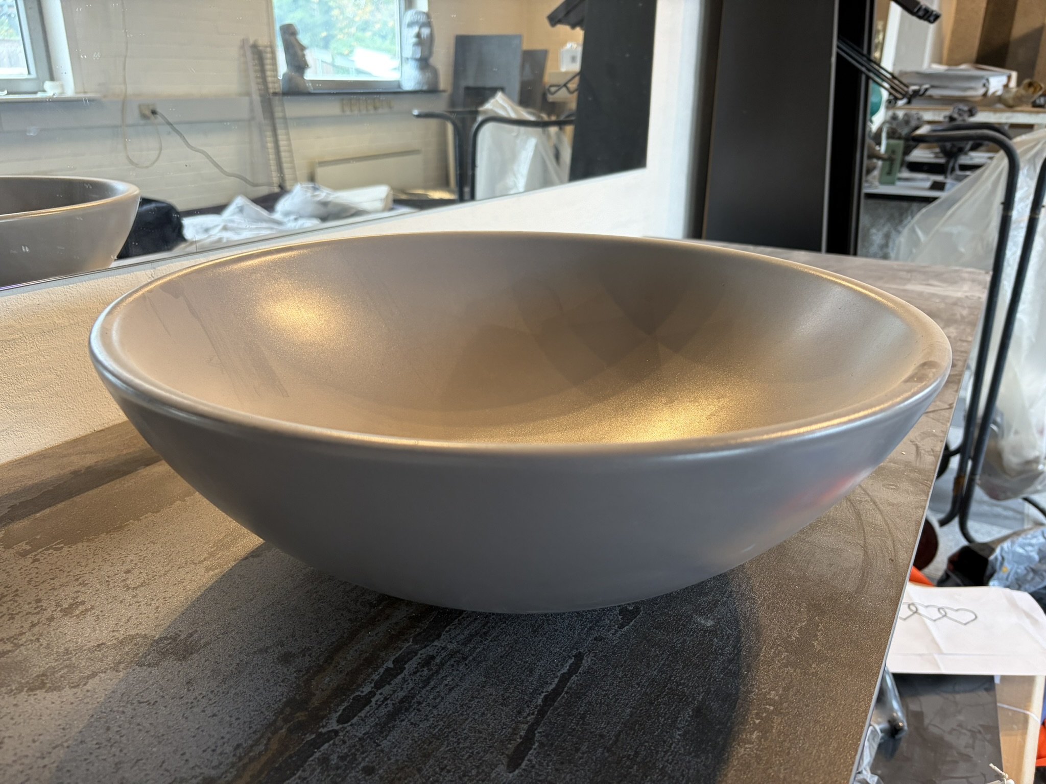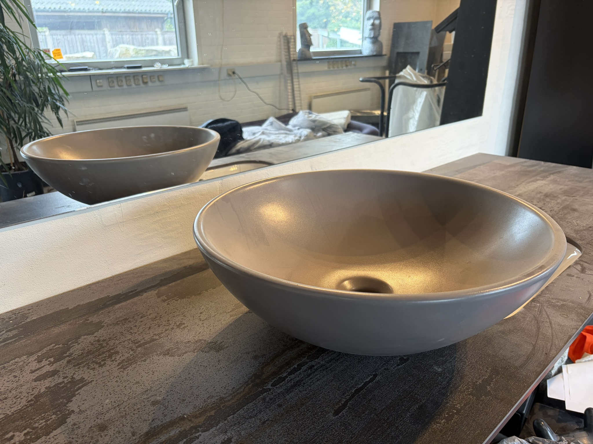 En unik keramisk håndvask fra Artceram, rund med bløde kanter i mat grå farve. Vasken måler 46 cm i diameter.