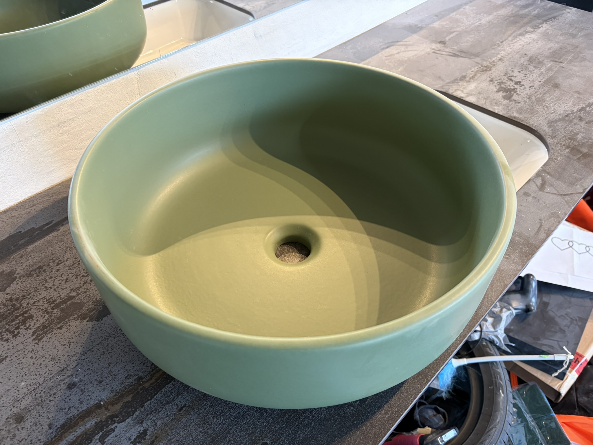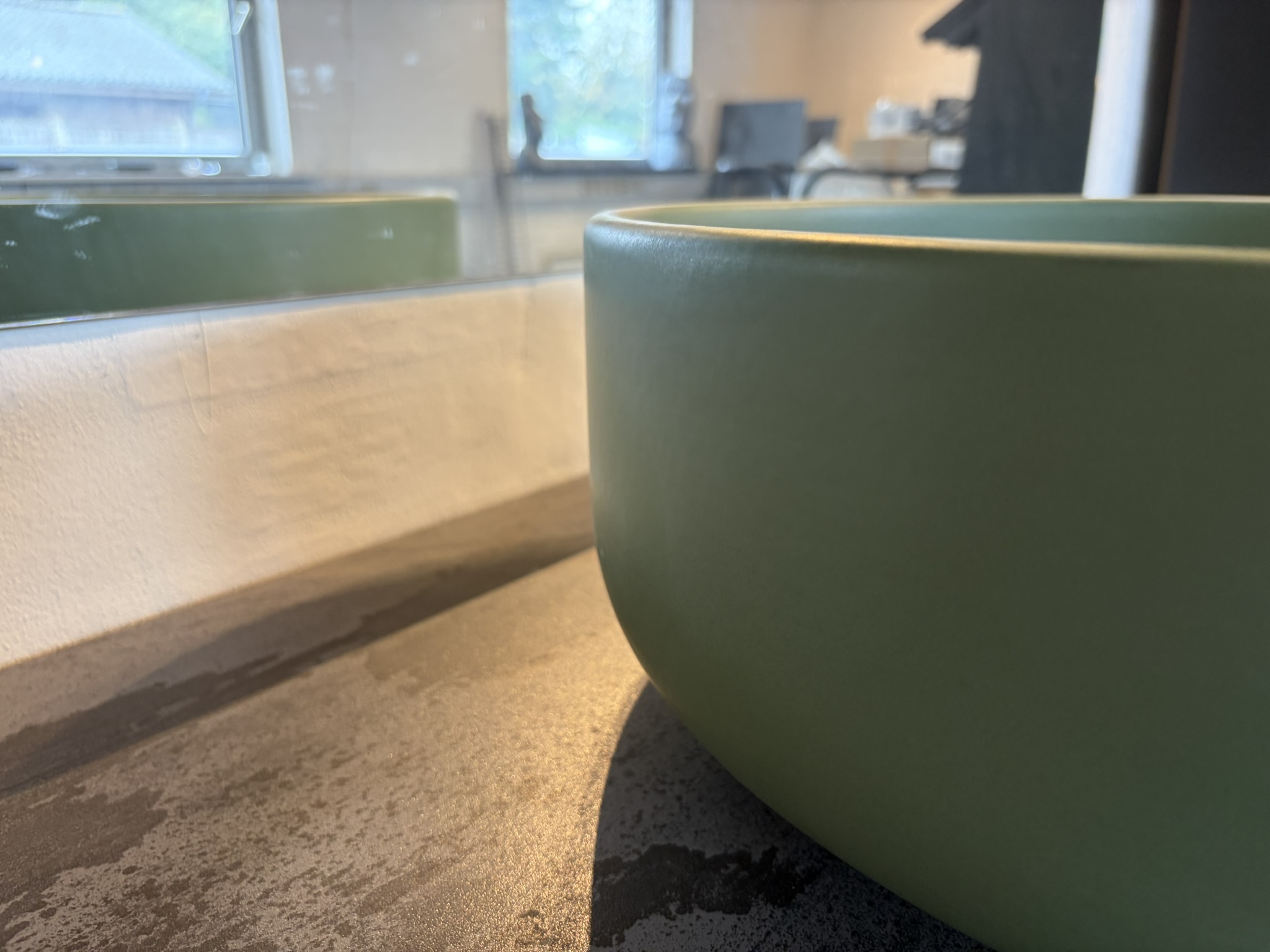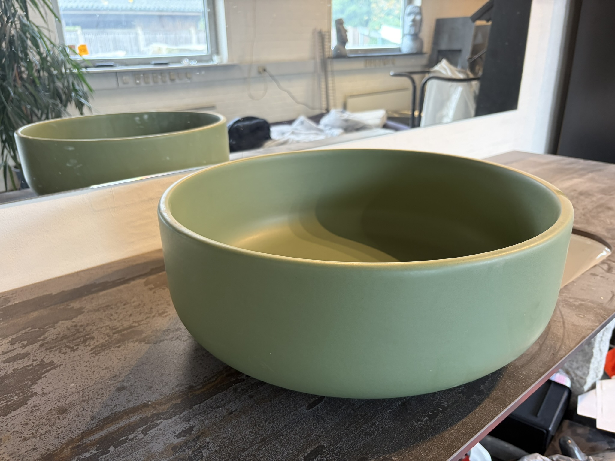 En unik keramisk håndvask fra Artceram, rund med bløde kanter i mat grøn farve. Vasken måler 46 cm i diameter.