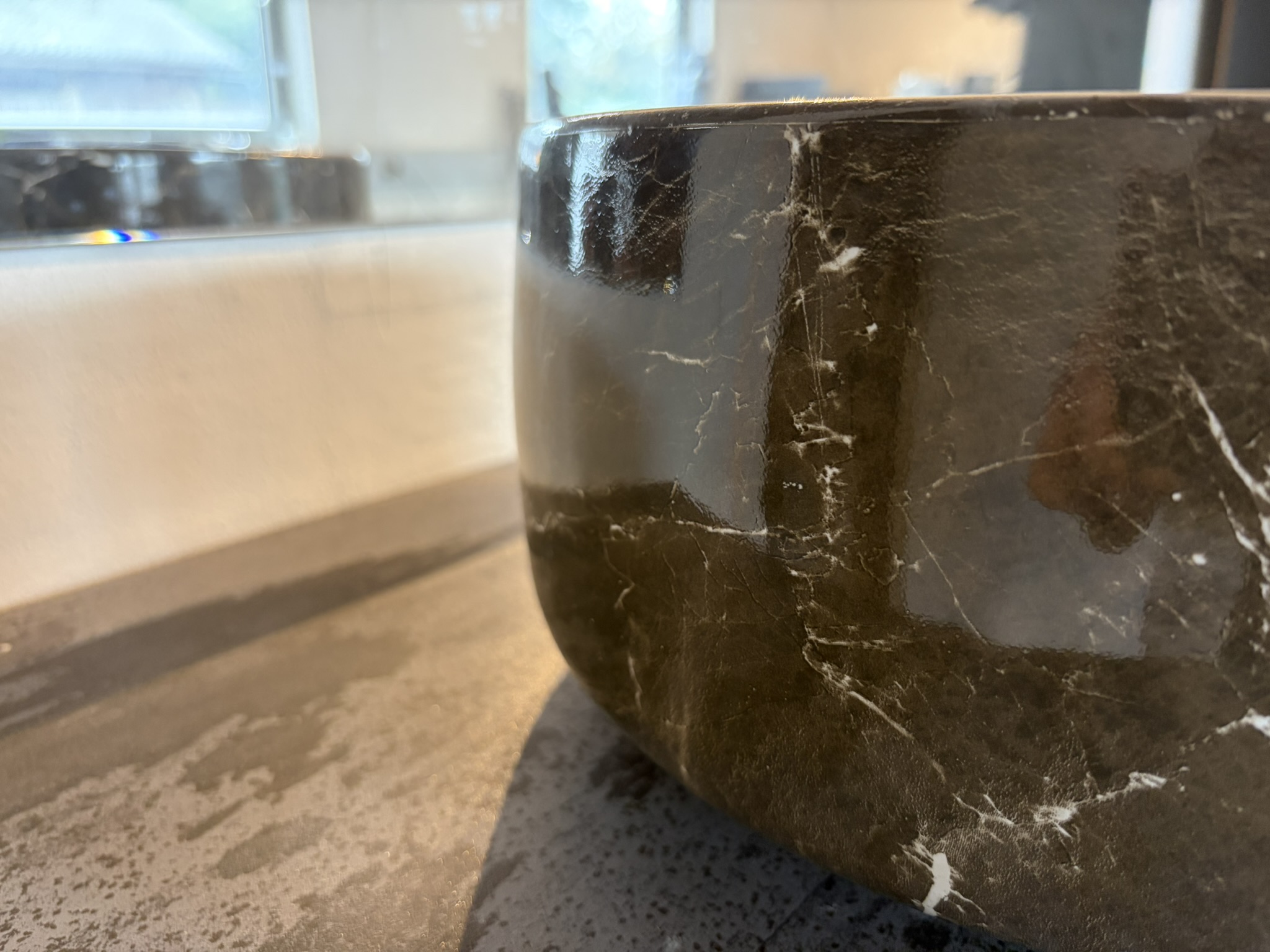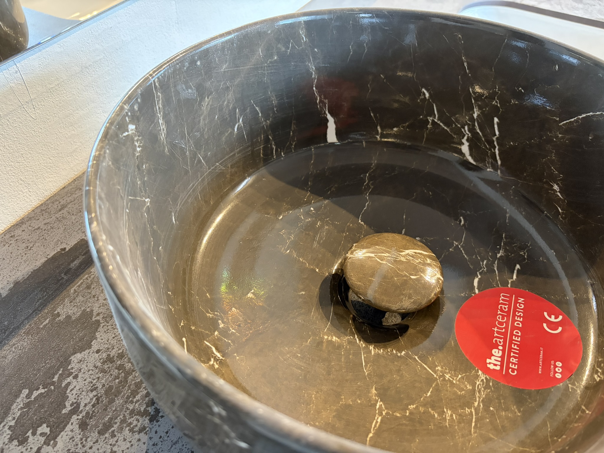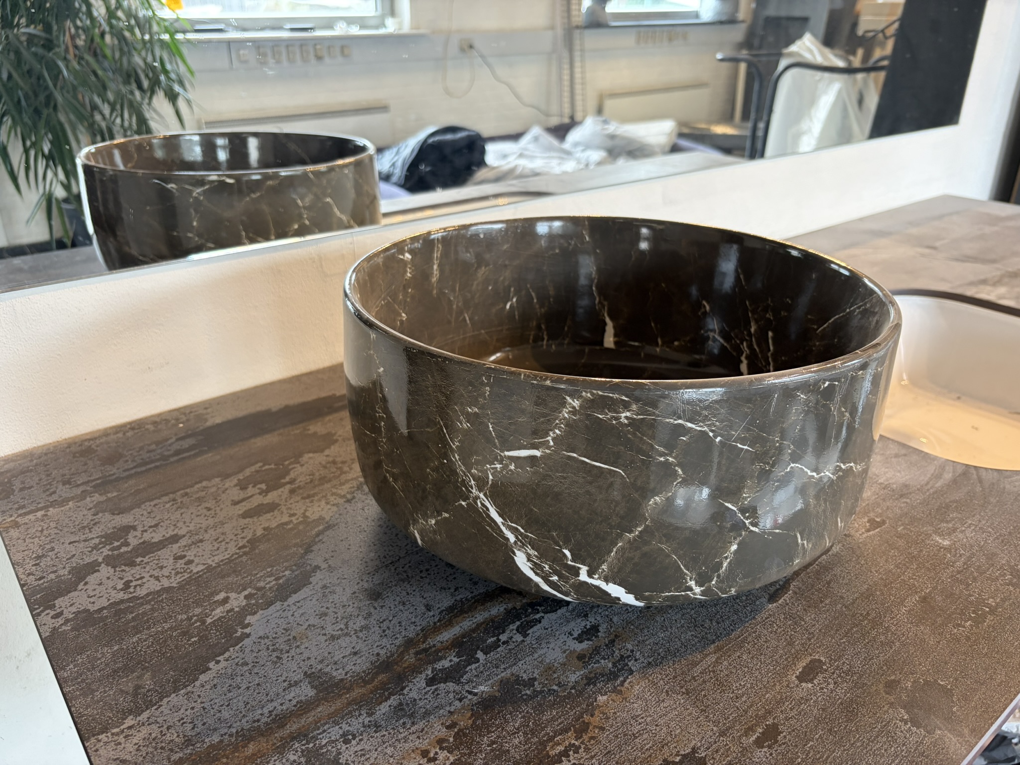 En elegant keramisk håndvask fra Artceram, rund med eksklusivt marmoreret look i mørke nuancer med lyse årer. Det blanke finish og det markante mønster giver vasken et luksuriøst og tidløst udtryk.