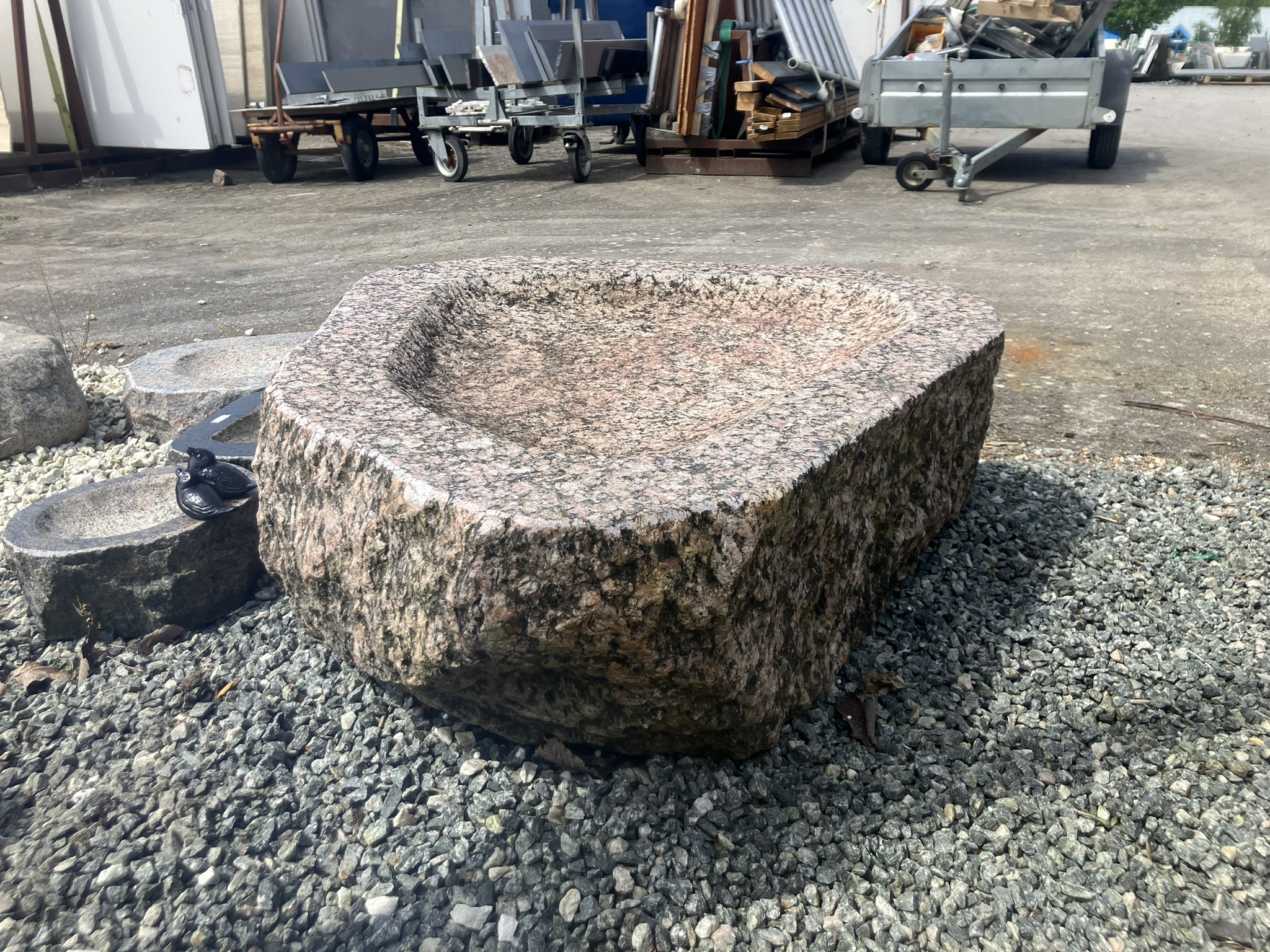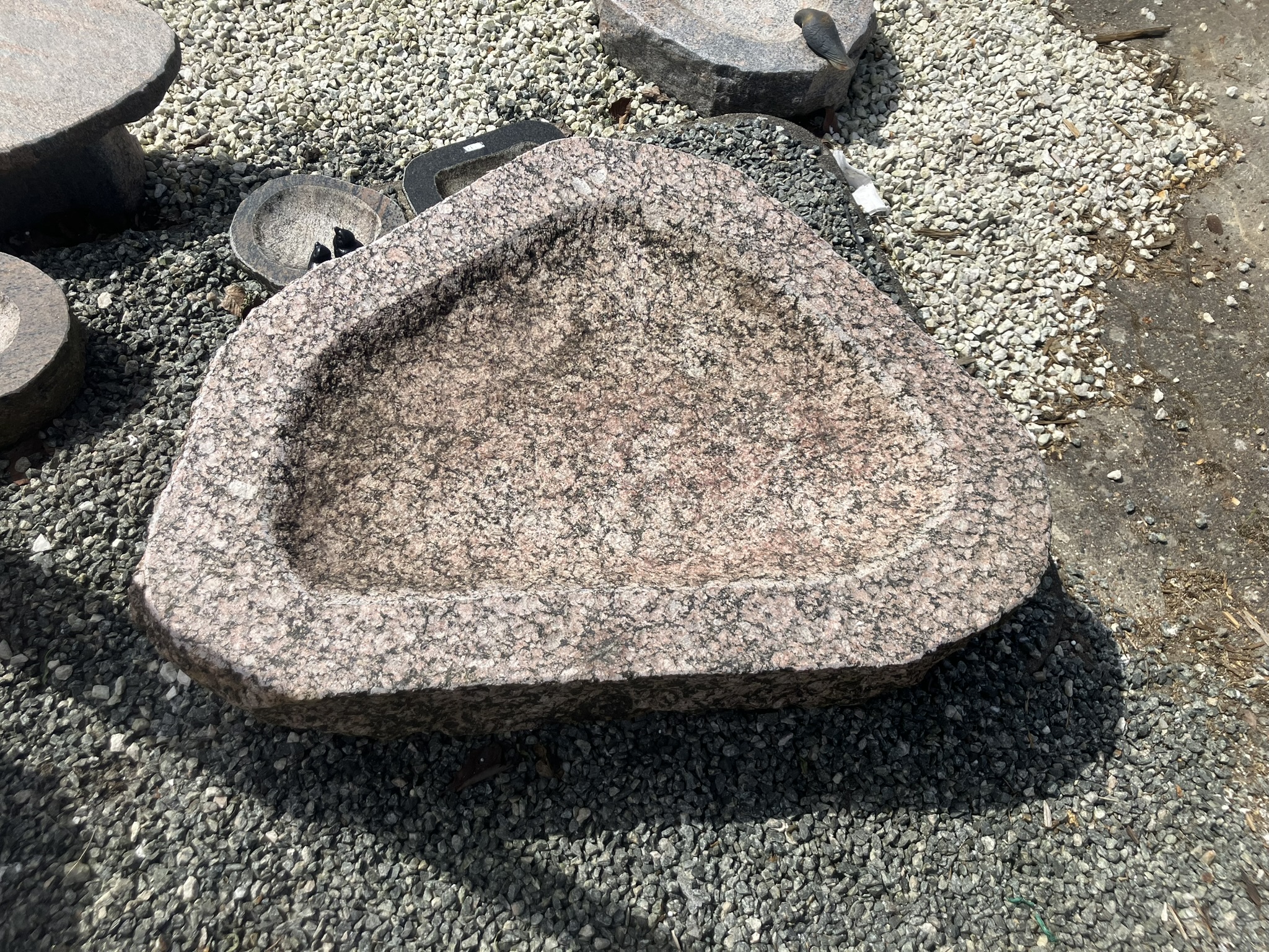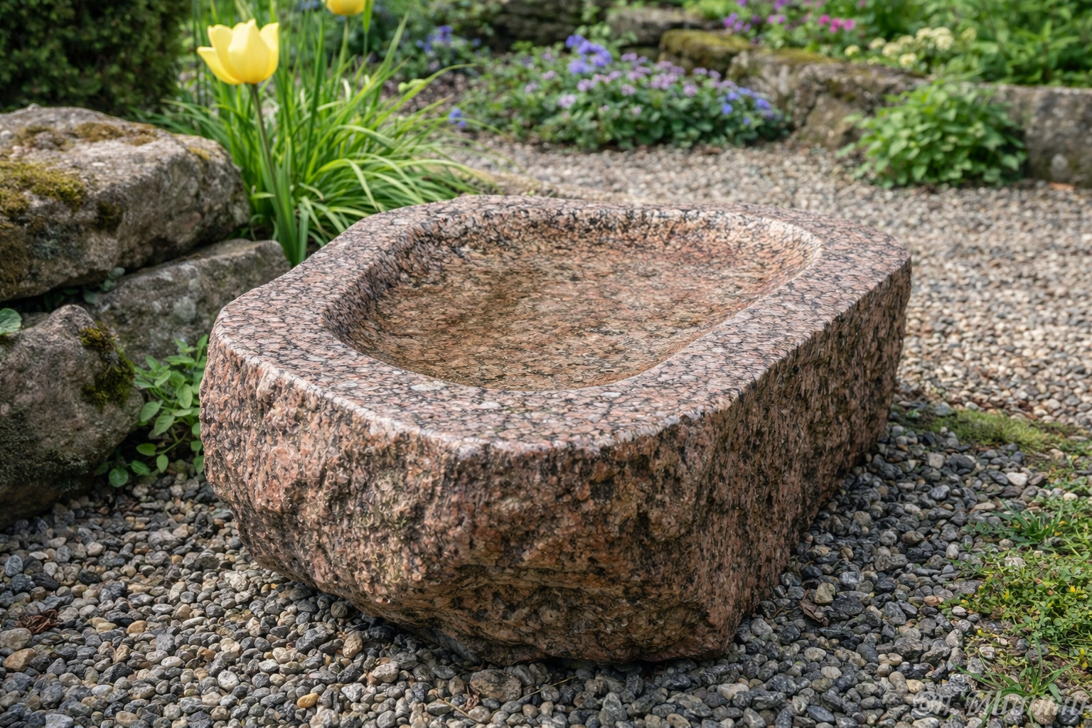 Dette smukke fuglebad er udført i massiv granit og formet med en blød, organisk silhuet, der passer naturligt ind i haven. Skålen er håndbearbejdet med en let ru overflade, som giver et autentisk og råt udtryk – samtidig med at den er skridsikker for fuglene.