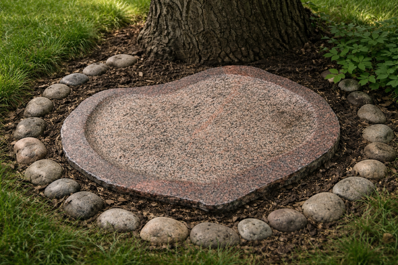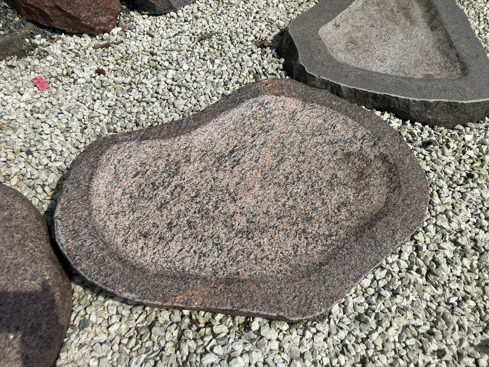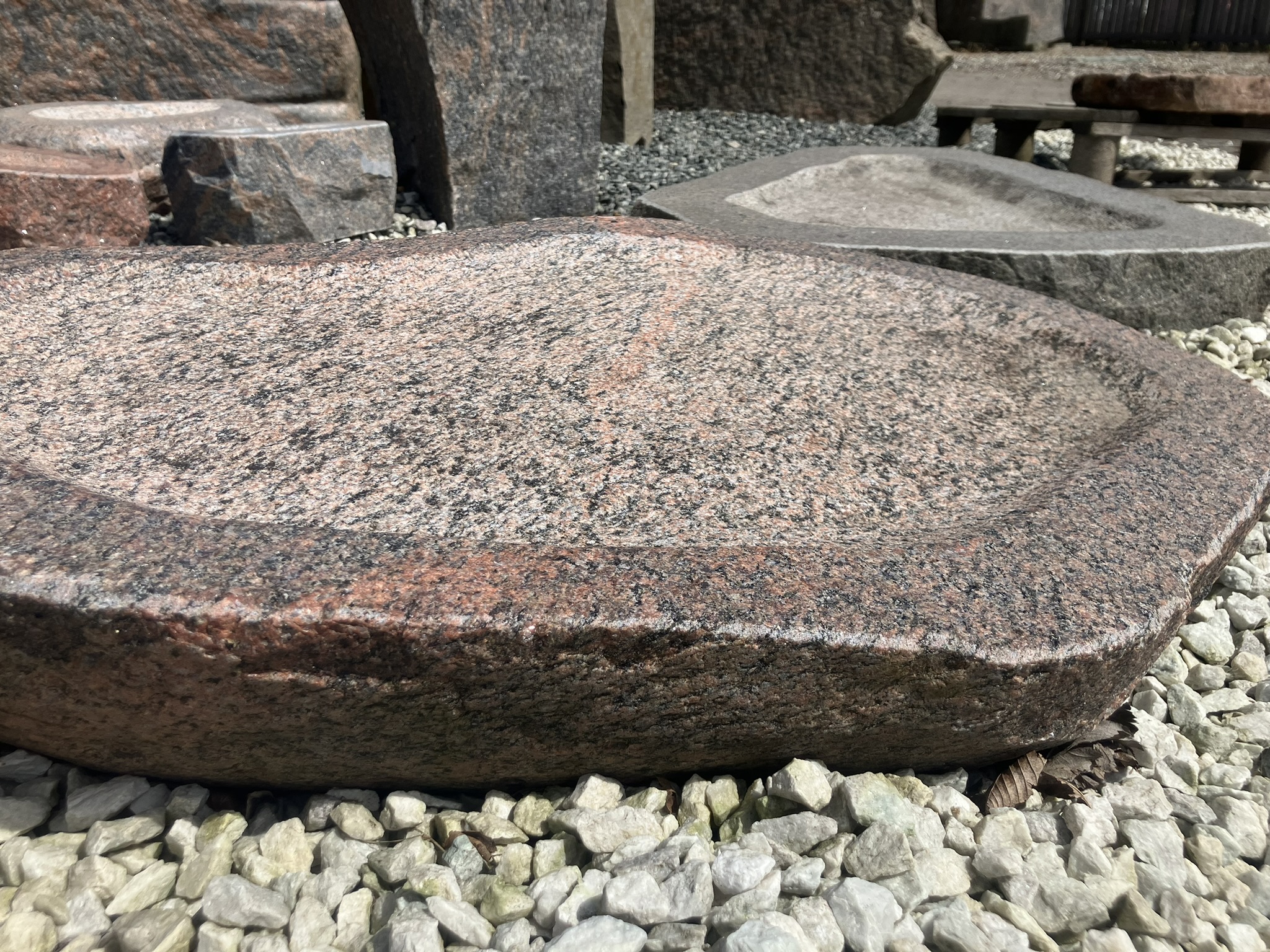 Dette smukke fuglebad er udført i massiv granit og formet med en blød, organisk silhuet, der passer naturligt ind i haven. Skålen er håndbearbejdet med en let ru overflade, som giver et autentisk og råt udtryk – samtidig med at den er skridsikker for fuglene.