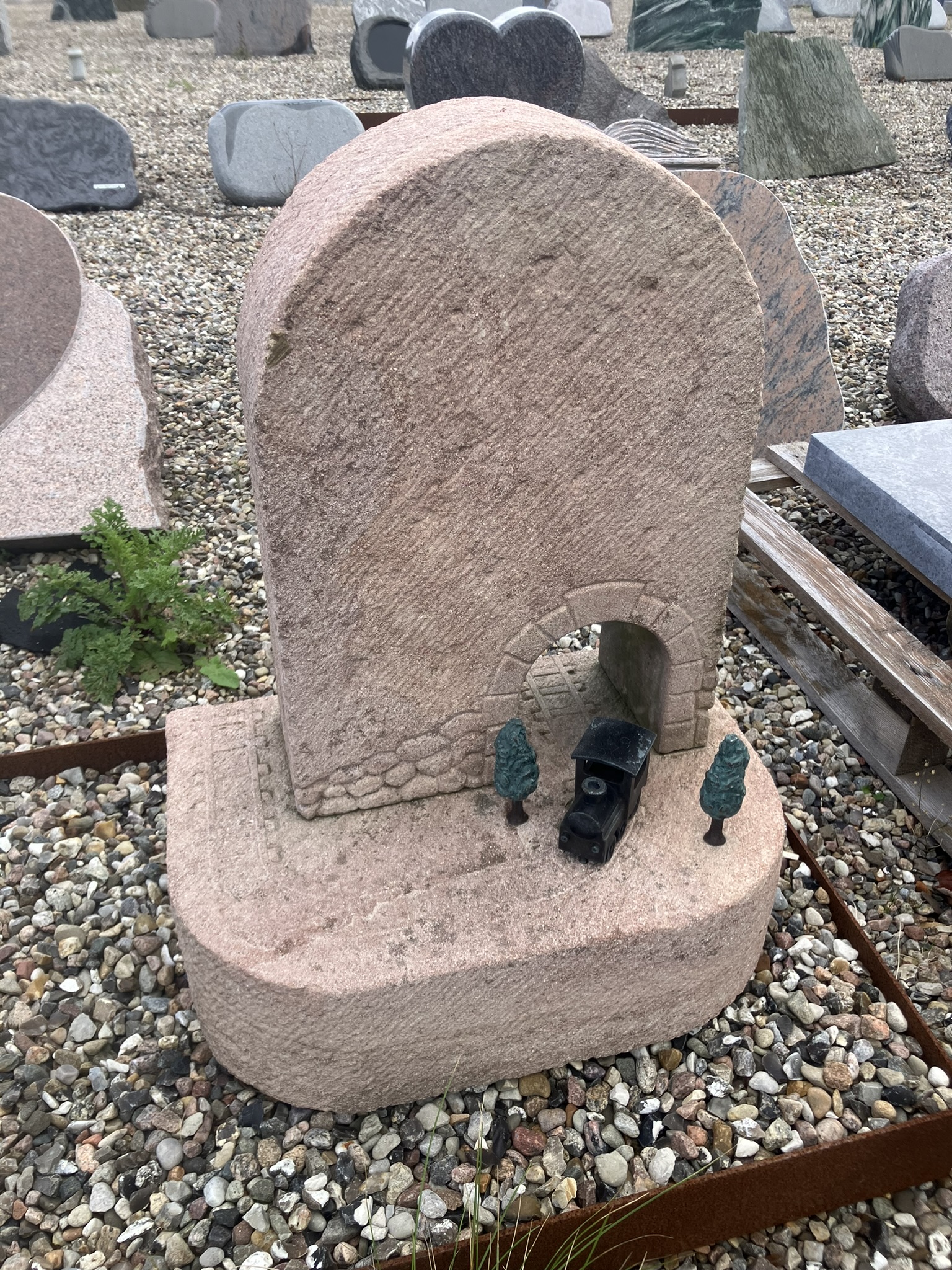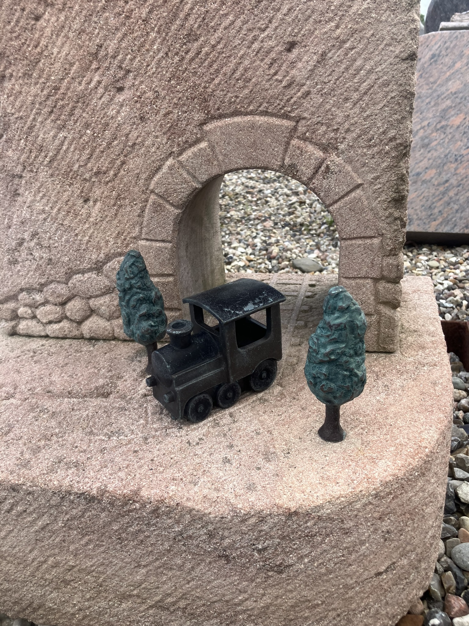 Nexø Sandsten er en traditionel bornholmsk natursten, kendt for sine varme nuancer og naturlige spil. Den huggede overflade giver stenen et rustikt og værdigt udtryk, hvor materialets oprindelige karakter står frem. Som en særlig detalje er stenen udsmykket med et tog i bronze, der tilføjer et personligt præg og gør mindet helt unikt.