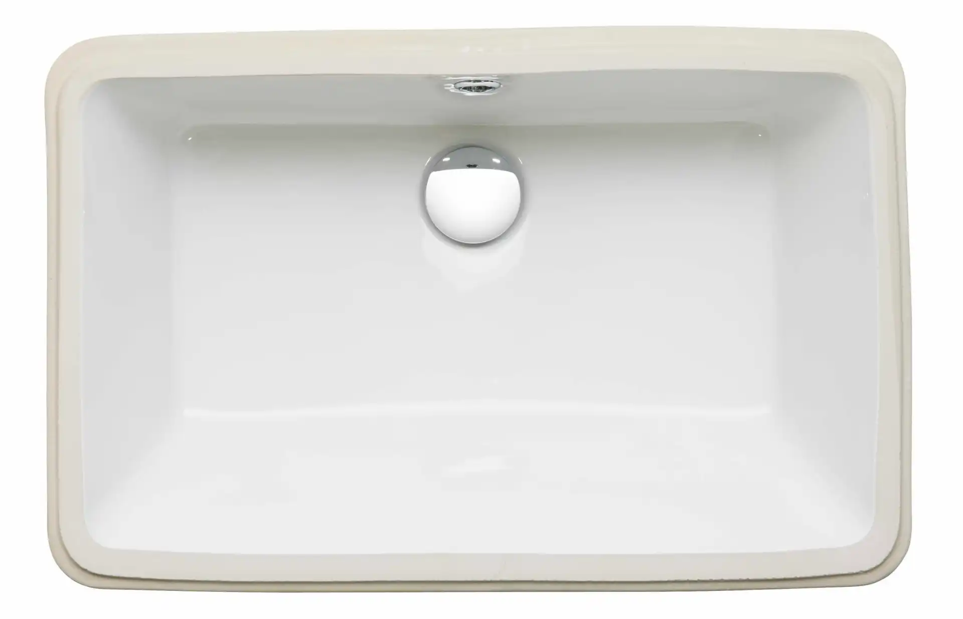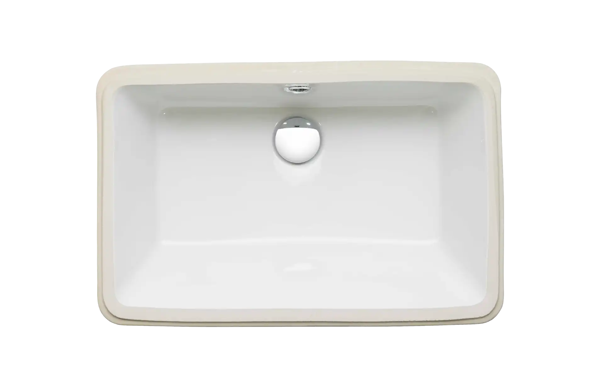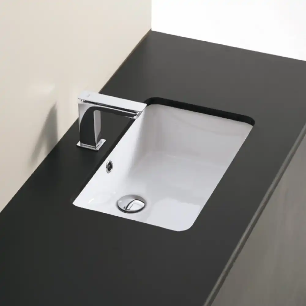Hvid porcelænsvask til underlimning i et firkantet og elegant design uden hanehul. Vasken har en god størrelse, der passer til ethvert badeværelse.